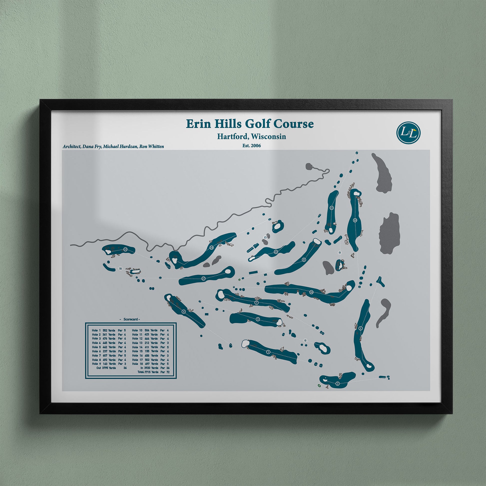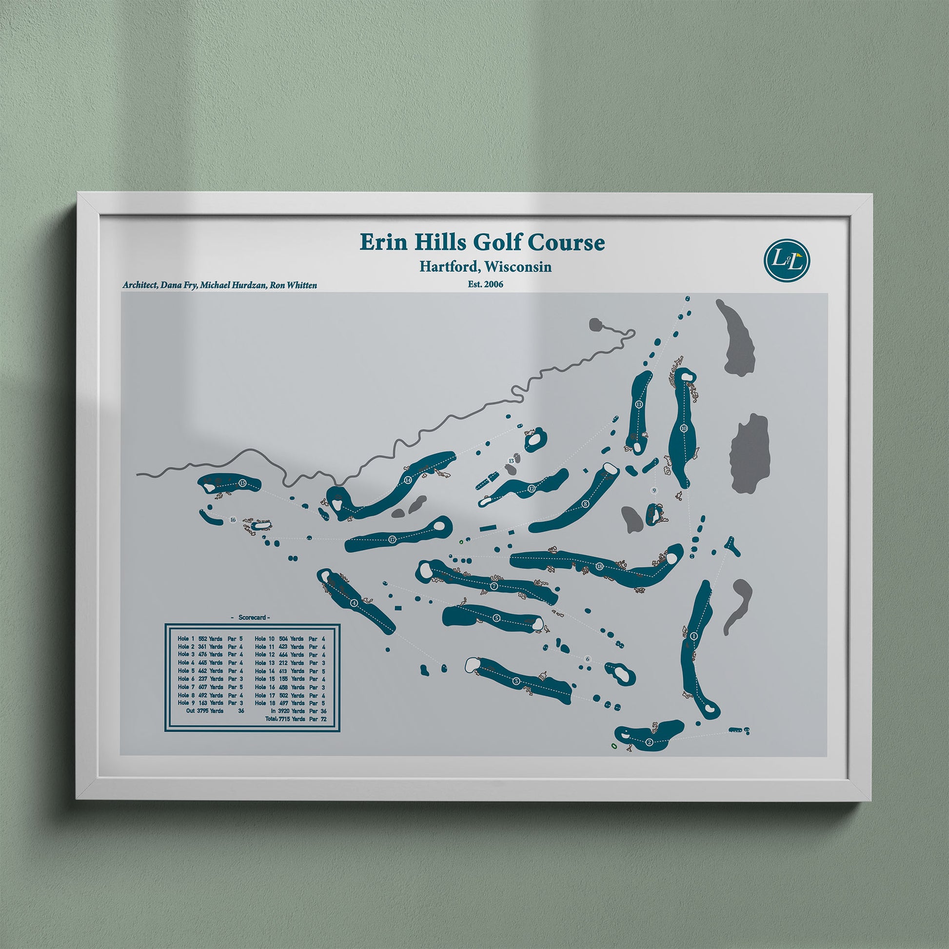 Experience the colossal scale of a U.S. Open venue with this detailed framed golf course map print of Erin Hills, carved from the glacial landscape of Wisconsin’s Kettle Moraine.
