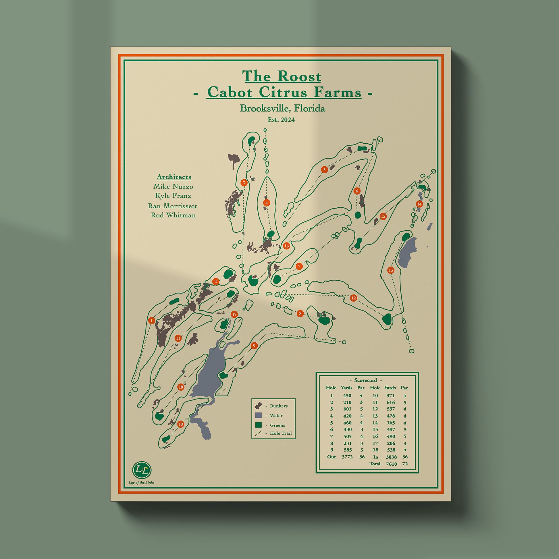 Explore the strategic nuance of Florida's newest gem with this The Roost at Cabot Citrus Farms map print, detailing the Mike Nuzzo and Ran Morrissett design that winds through sandy dunes and moss-draped oaks in Brooksville.